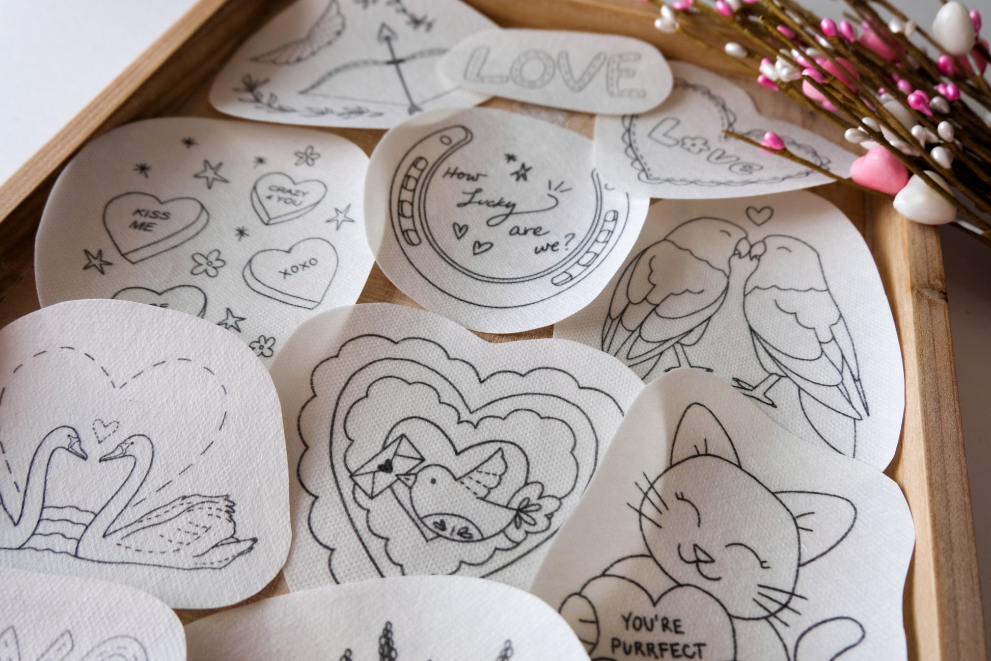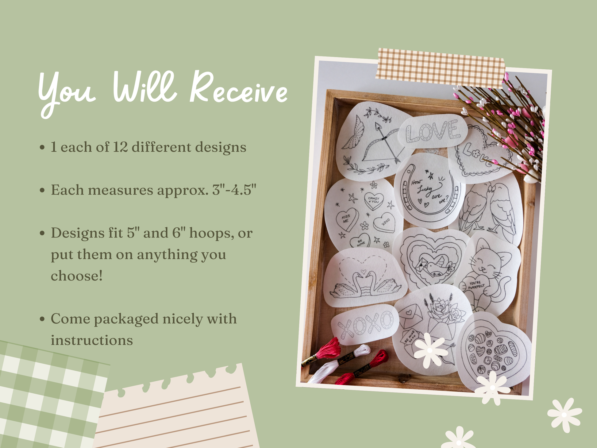 Valentine's Day Pack includes all 12 designs you see here. Your wash away embroidery stickers come neatly packaged with full instructions. Packaged for gift giving as well!