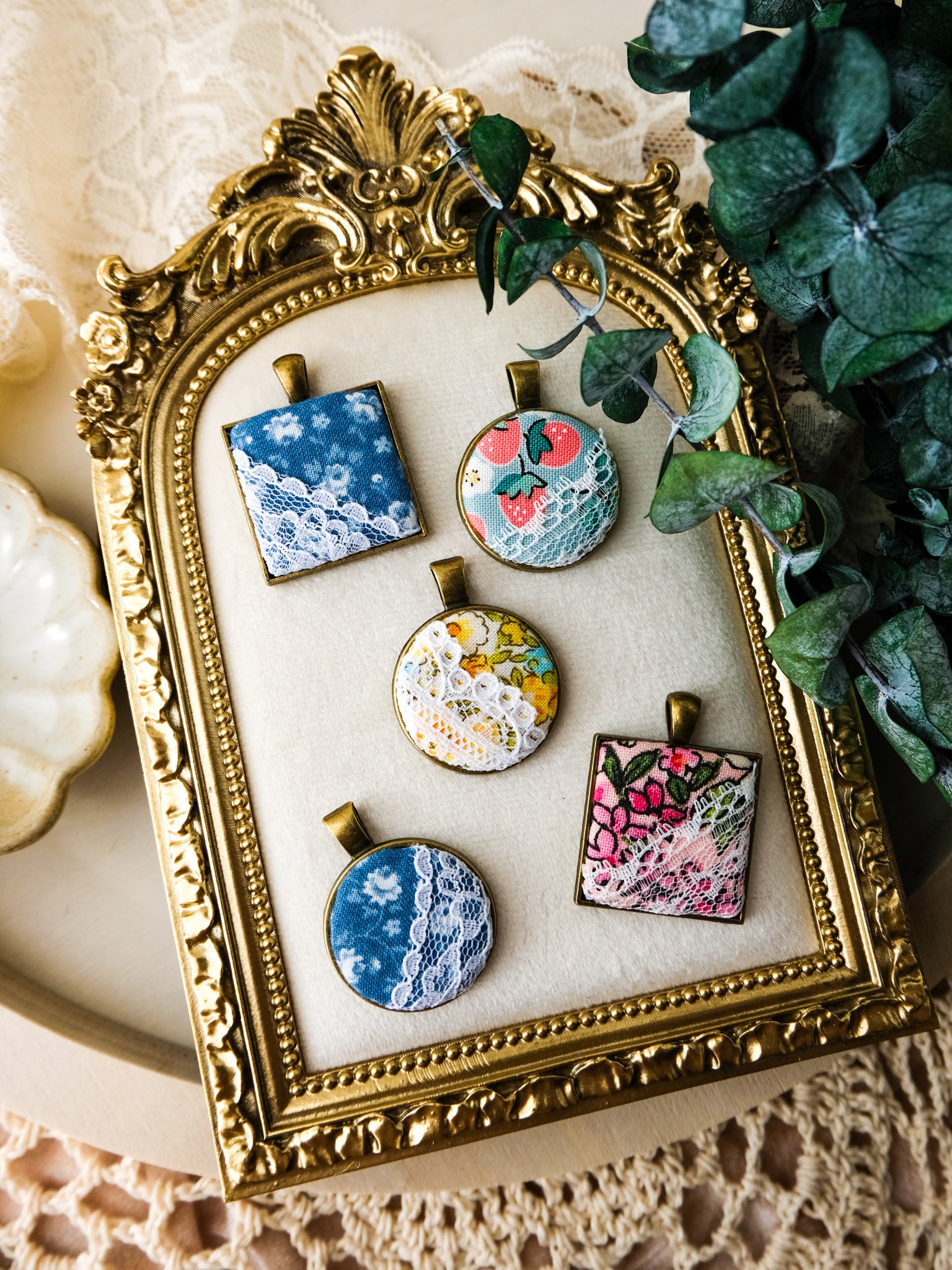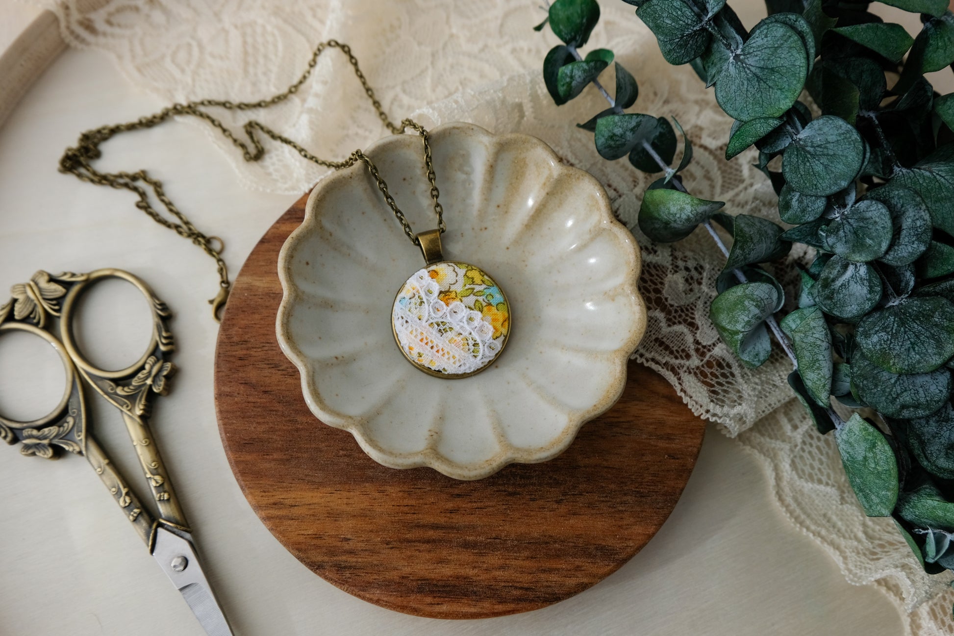 Sweet fabrics and lace are the perfect partners! Textile art pendants with carefully handpicked patterns and a touch of lace for adding a vintage charm to your outfit. This round pendant features florals in yellow and blue and delicate white lace.