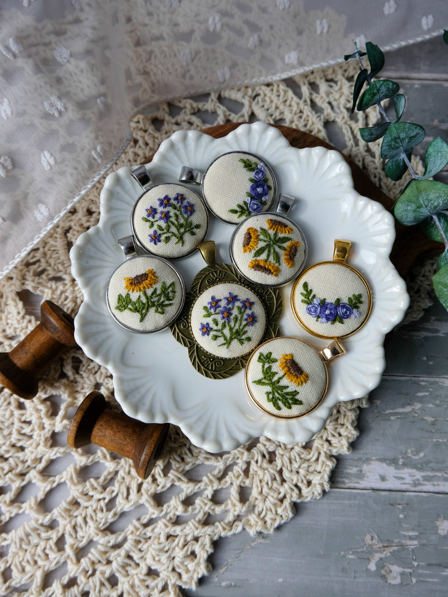 Wear a little sunshine around your neck with this charming hand embroidered necklace. A cheerful burst of sunflowers bloom against a soft ivory linen backdrop, nestled in a 1" silver colored bezel that catches the light beautifully. Each piece is lovingly handcrafted with meticulous embroidery work, making it truly one of a kind.