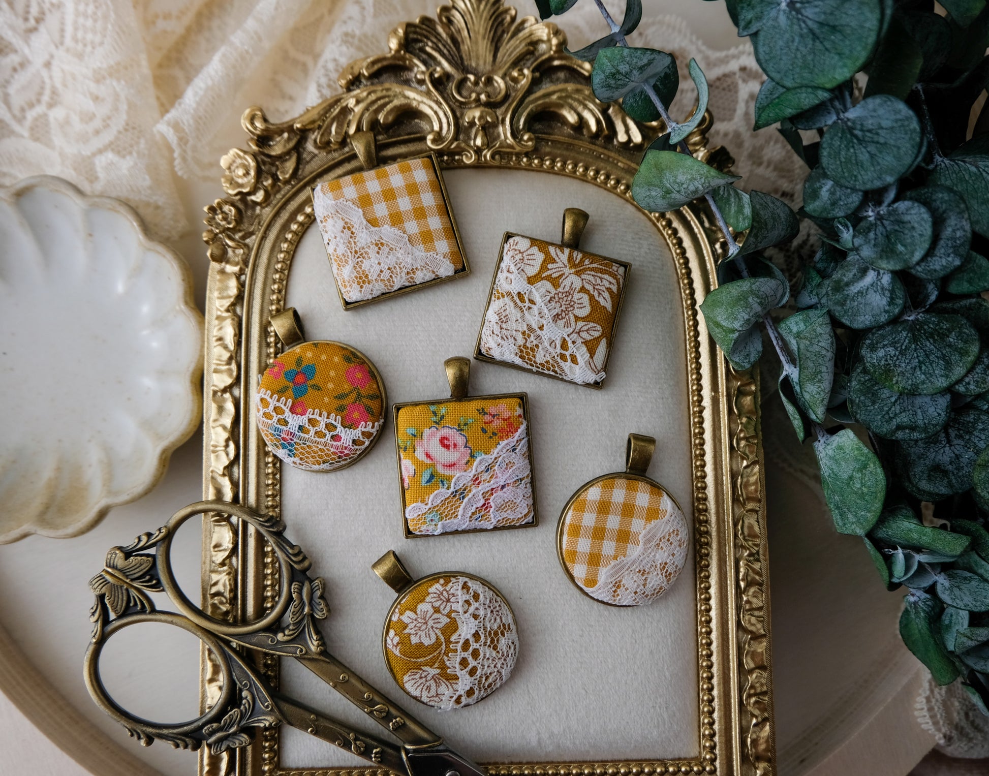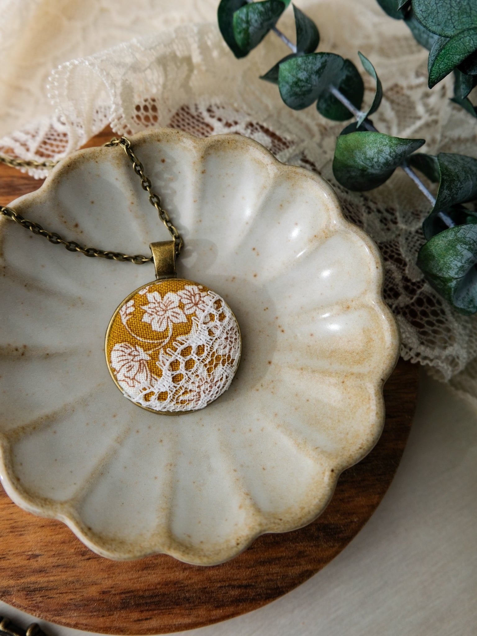 Sweet fabrics and lace are the perfect partners! Textile art pendants with carefully handpicked patterns and a touch of lace for adding a vintage charm to your outfit. This round pendant features a sweet gold floral fabric and white lace.