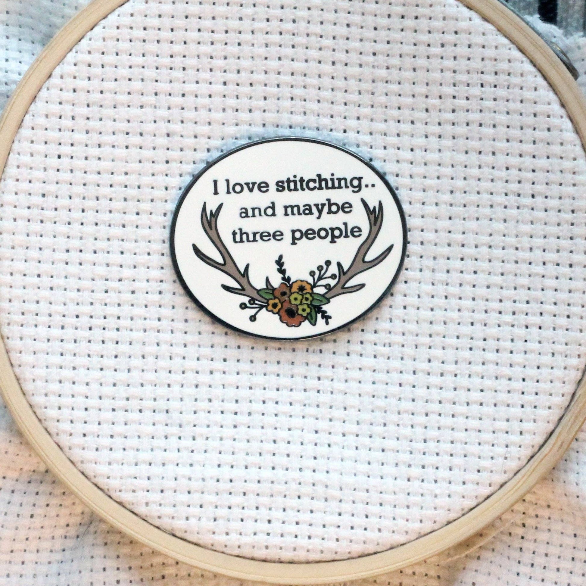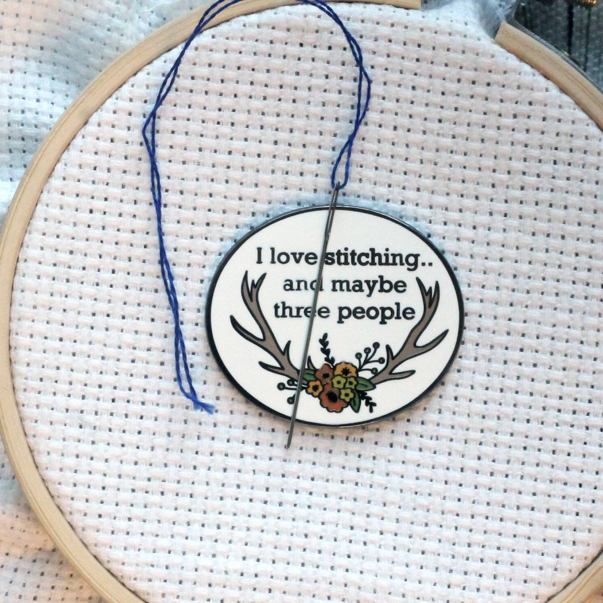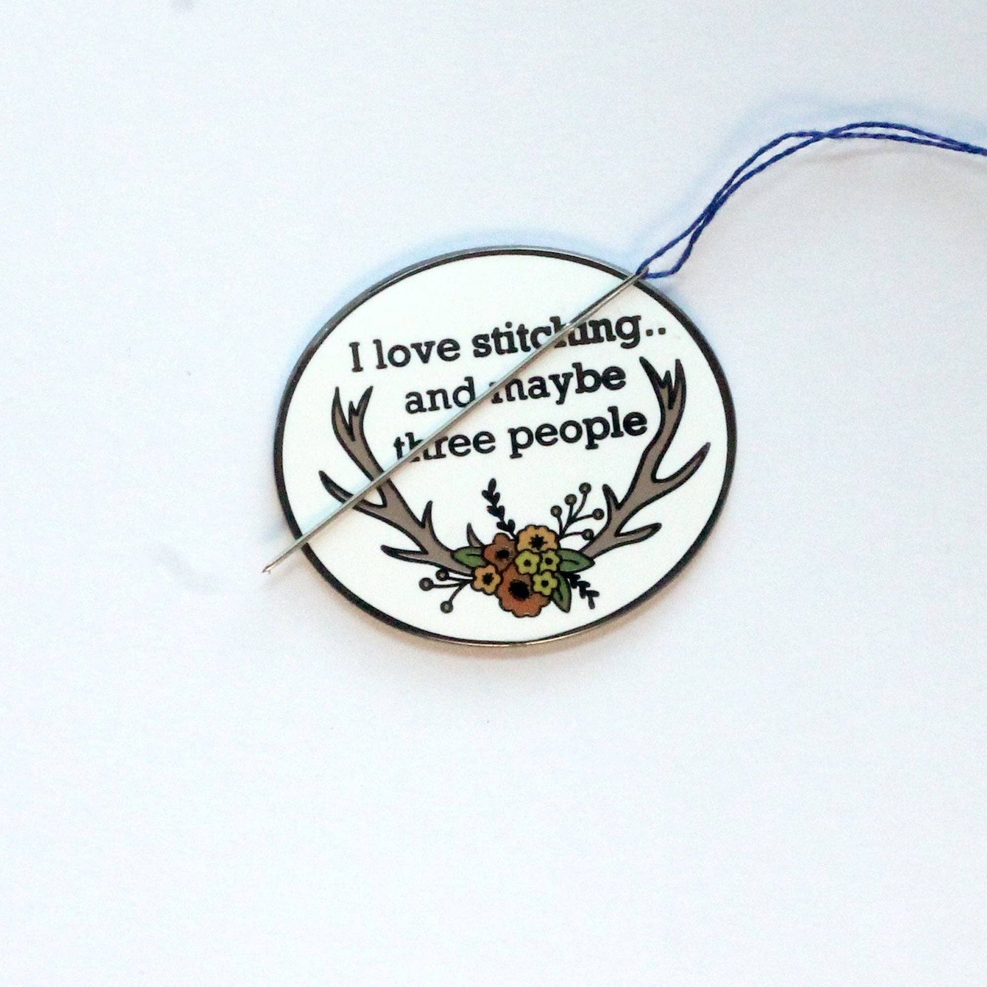 This is a custom drawn hard enamel needle minder featuring a floral motif on a set of antlers, plus the phrase "I love stitching, and like three people" Never lose your needle, create unnecessary holes or get a rust stain from needles left in your needlework.