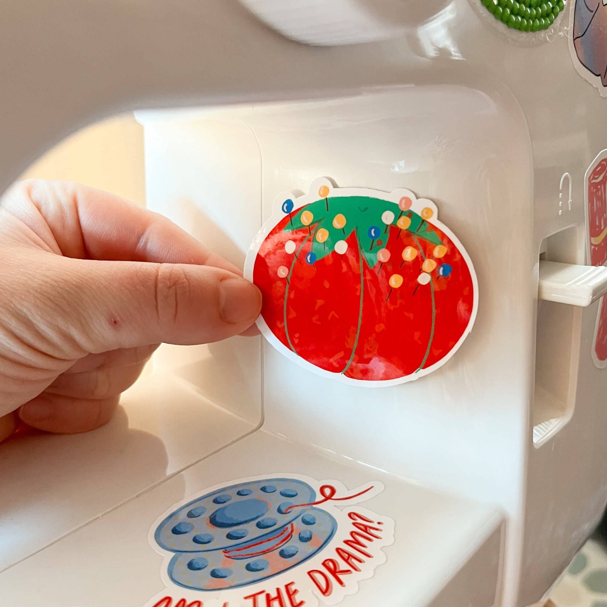 Tomato Pin Cushion Sticker for a sewing machine, water bottle, laptop, kindle, journal, window, or other smooth surfaces.